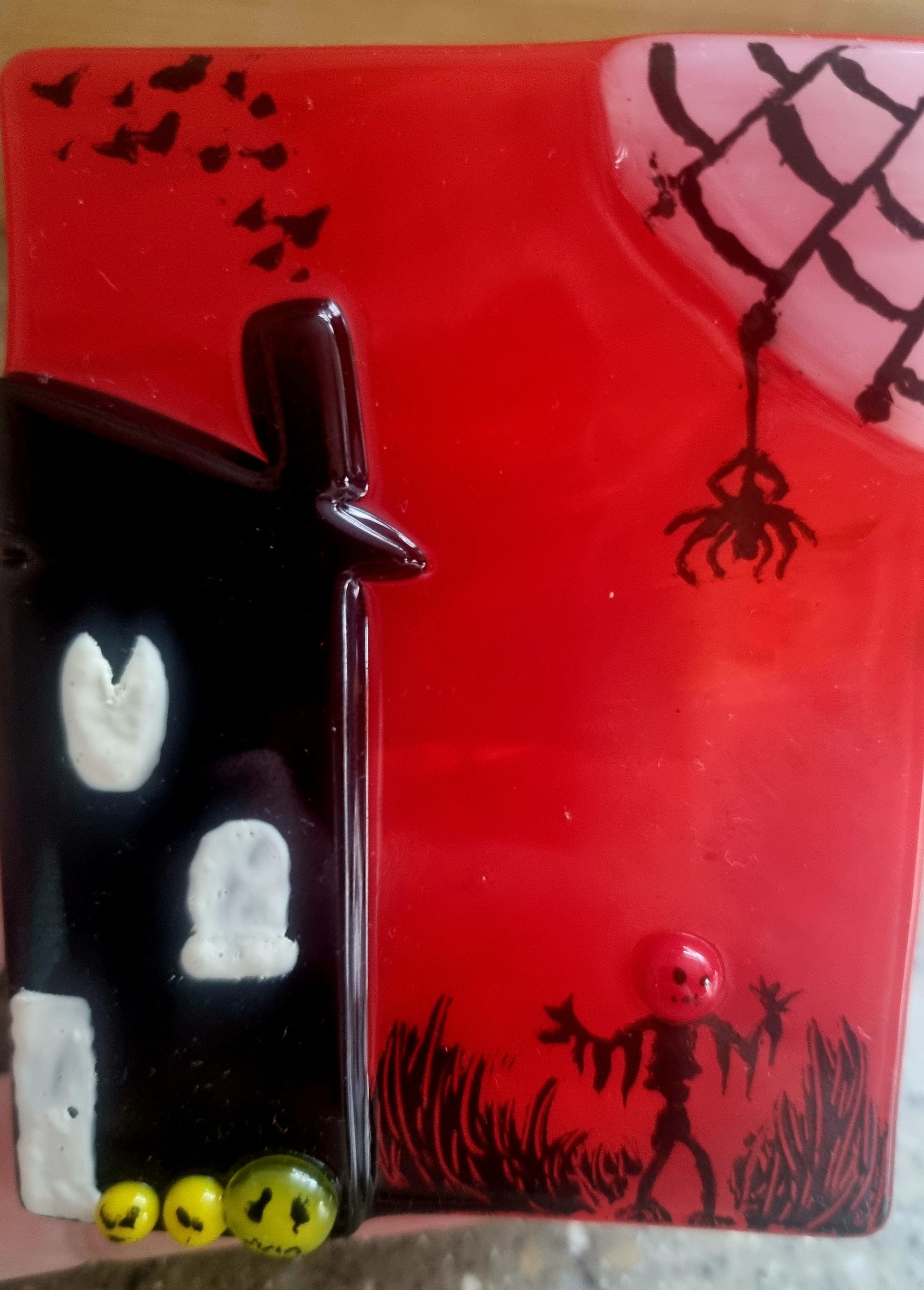 This hand made fused glass tealight holder is the perfect addition to your Halloween decor or a unique gift. Measuring approximately 9x6cm, it features a spooky house design that will add a touch of eerie charm. Perfect for creating a cozy and atmospheric ambiance.