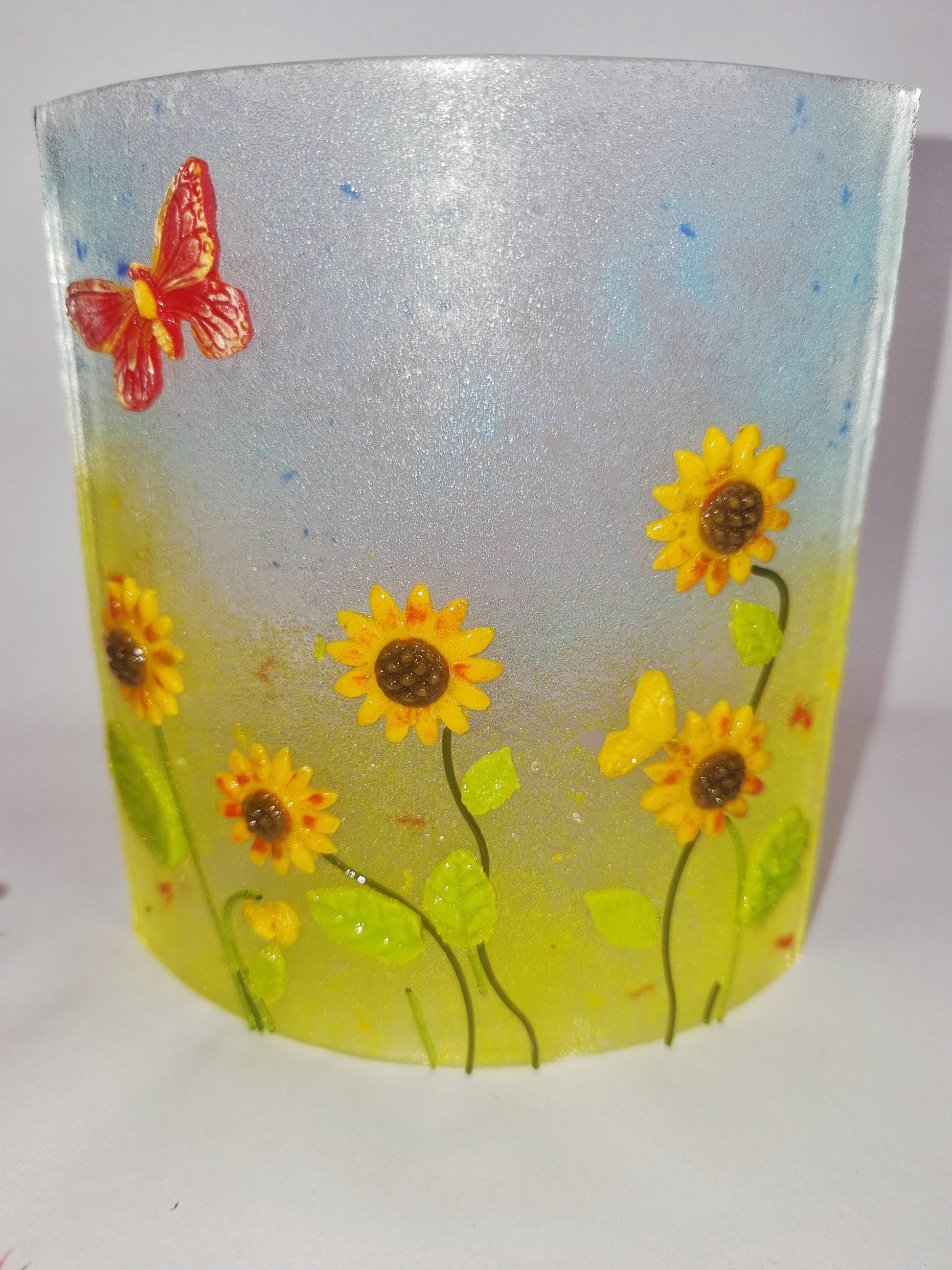 This stunning, handmade fused glass piece features vibrant sunflowers and a delicate butterfly. The intricate design is perfect for illuminating with a tealight and adding a touch of elegance to any space. Bring the beauty of nature into your home with this unique piece.
